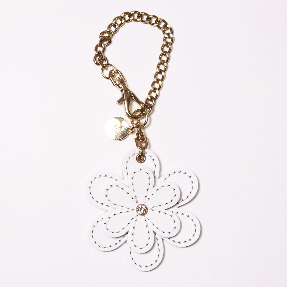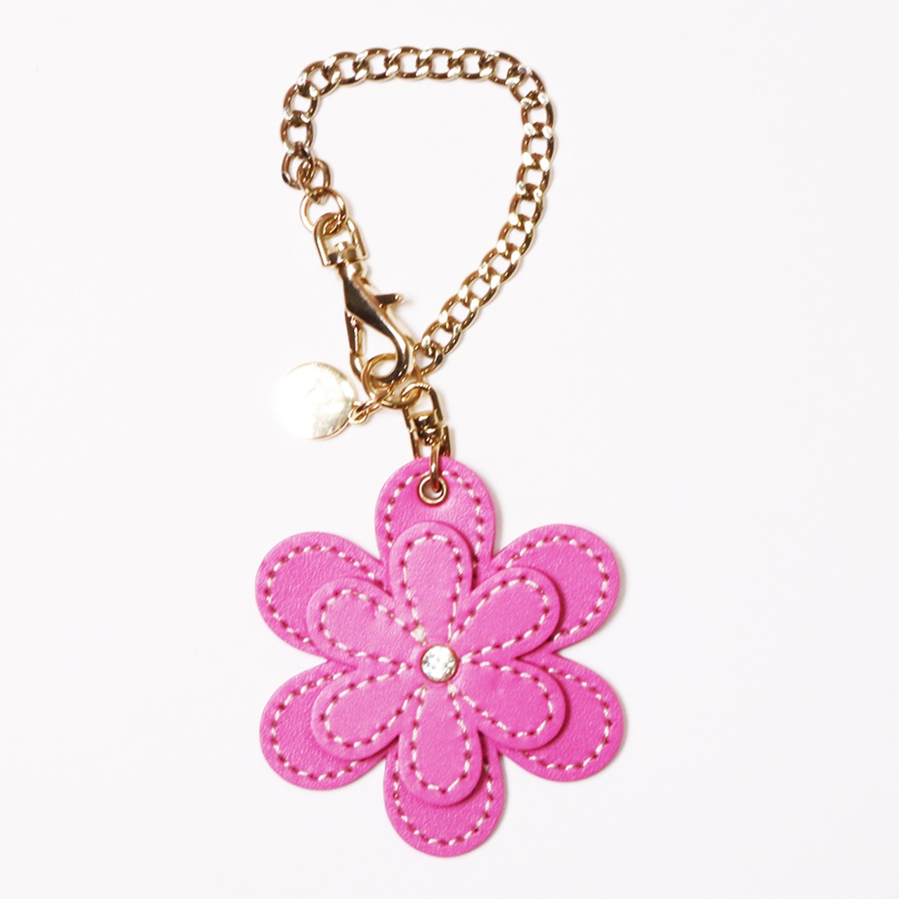 可愛らしい花のバッグチャームをご紹介します!カラーはピンク、ホワイト、オレンジ、パープルの4色展開となっています。牛革製で高級感もあり、さりげなくバッグをアップデートすることができます。